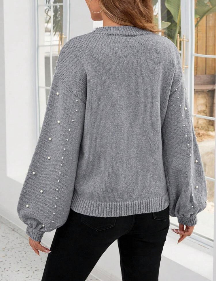 Tejido en hilo, con hermoso diseño y apliques de perlas. Manga tipo farol, silueta holgada.
